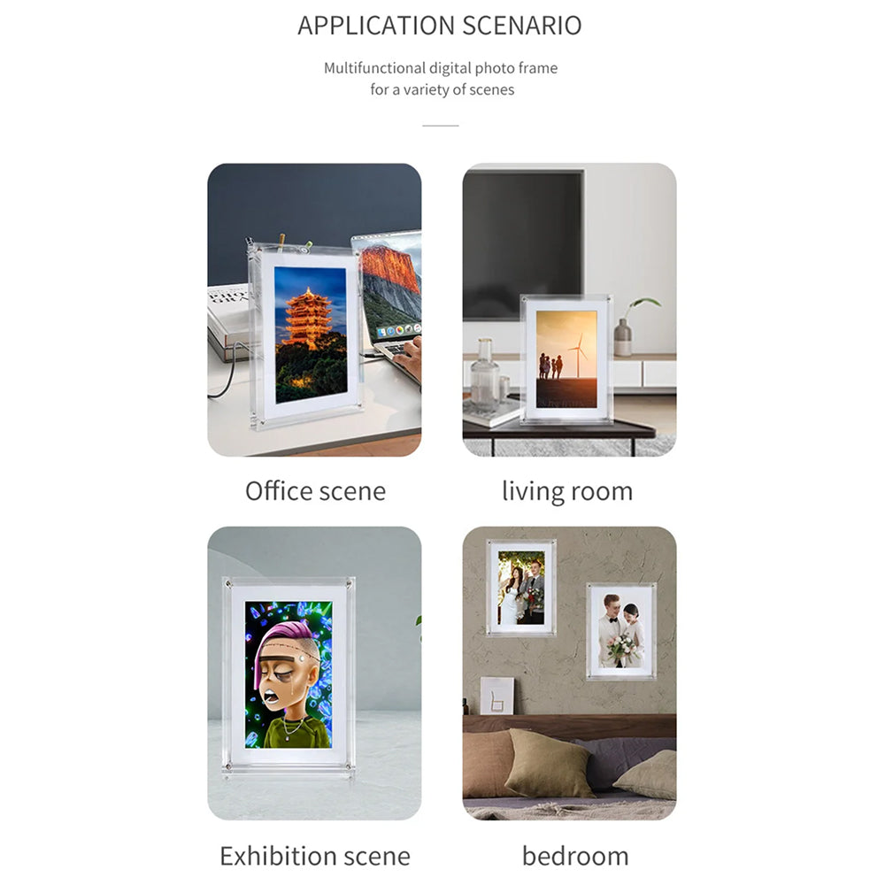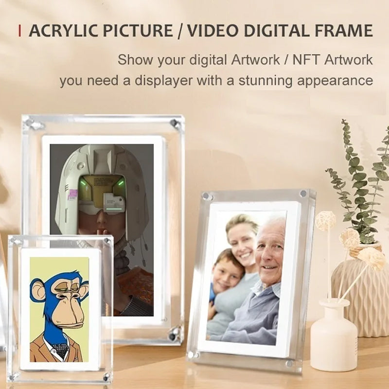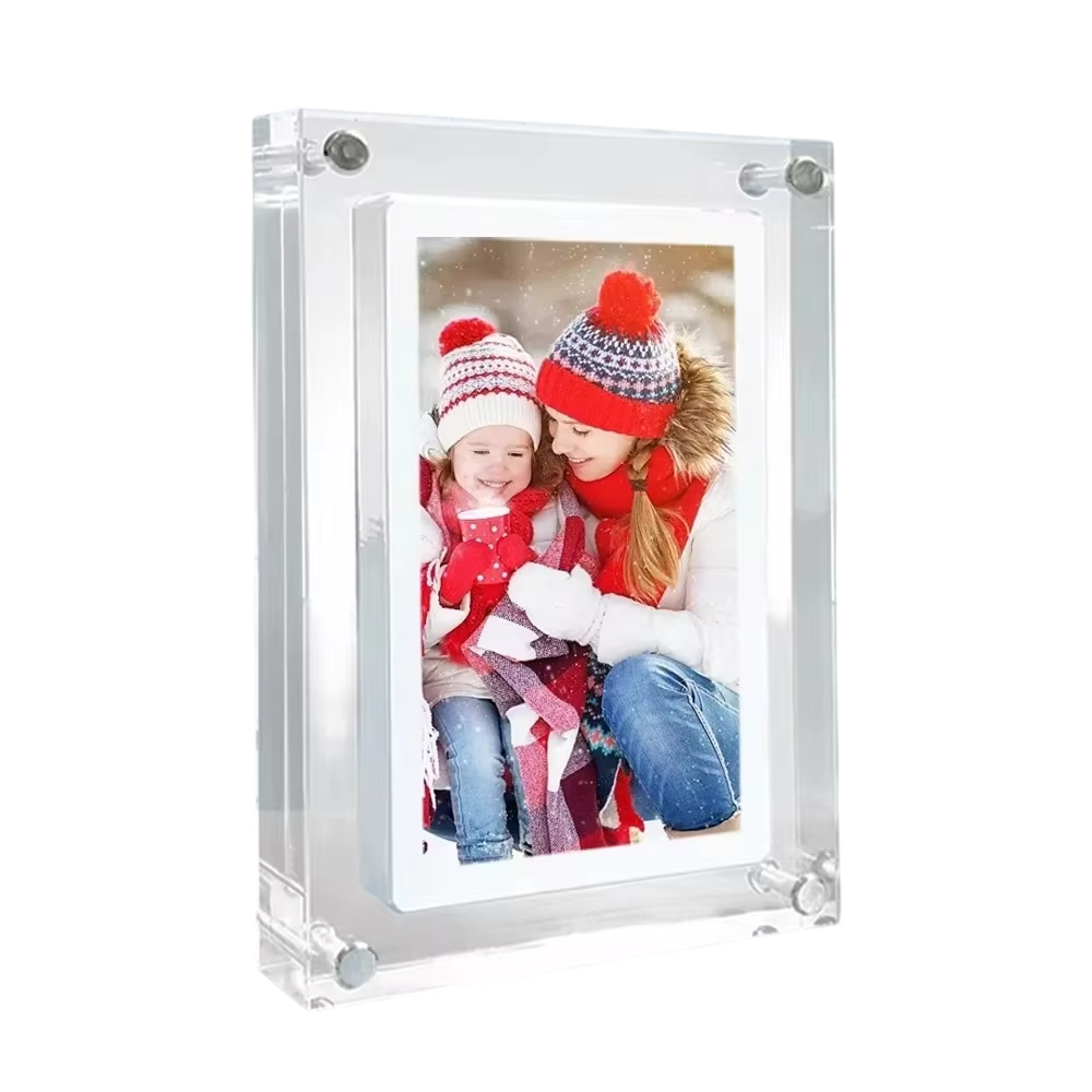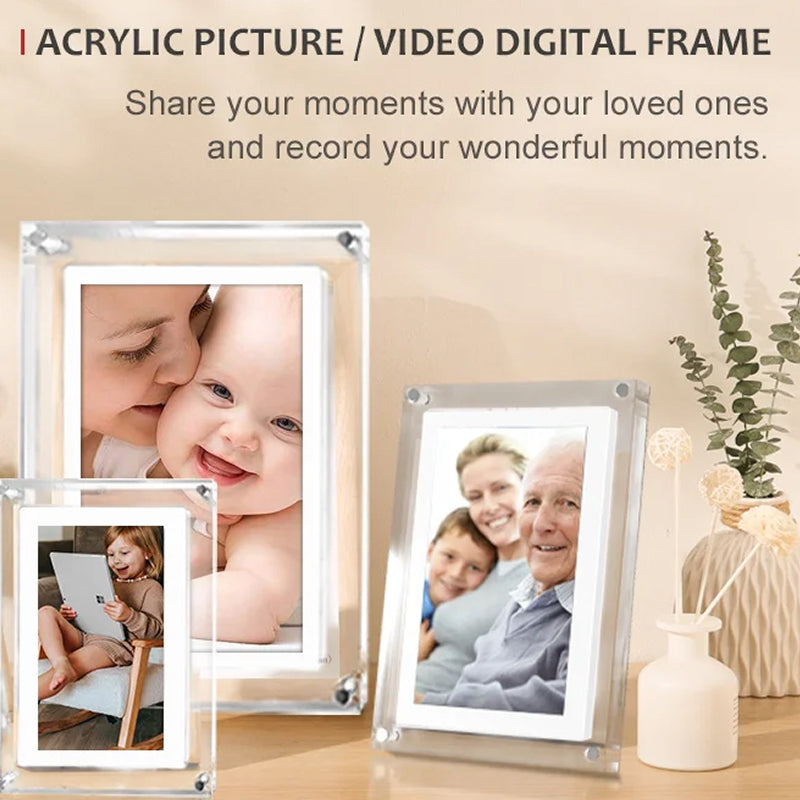 Compact portable design fits perfectly on desks, shelves, or nightstands while the elegant acrylic construction complements any decor style. Switch between vertical and horizontal orientations to match your content and space requirements.